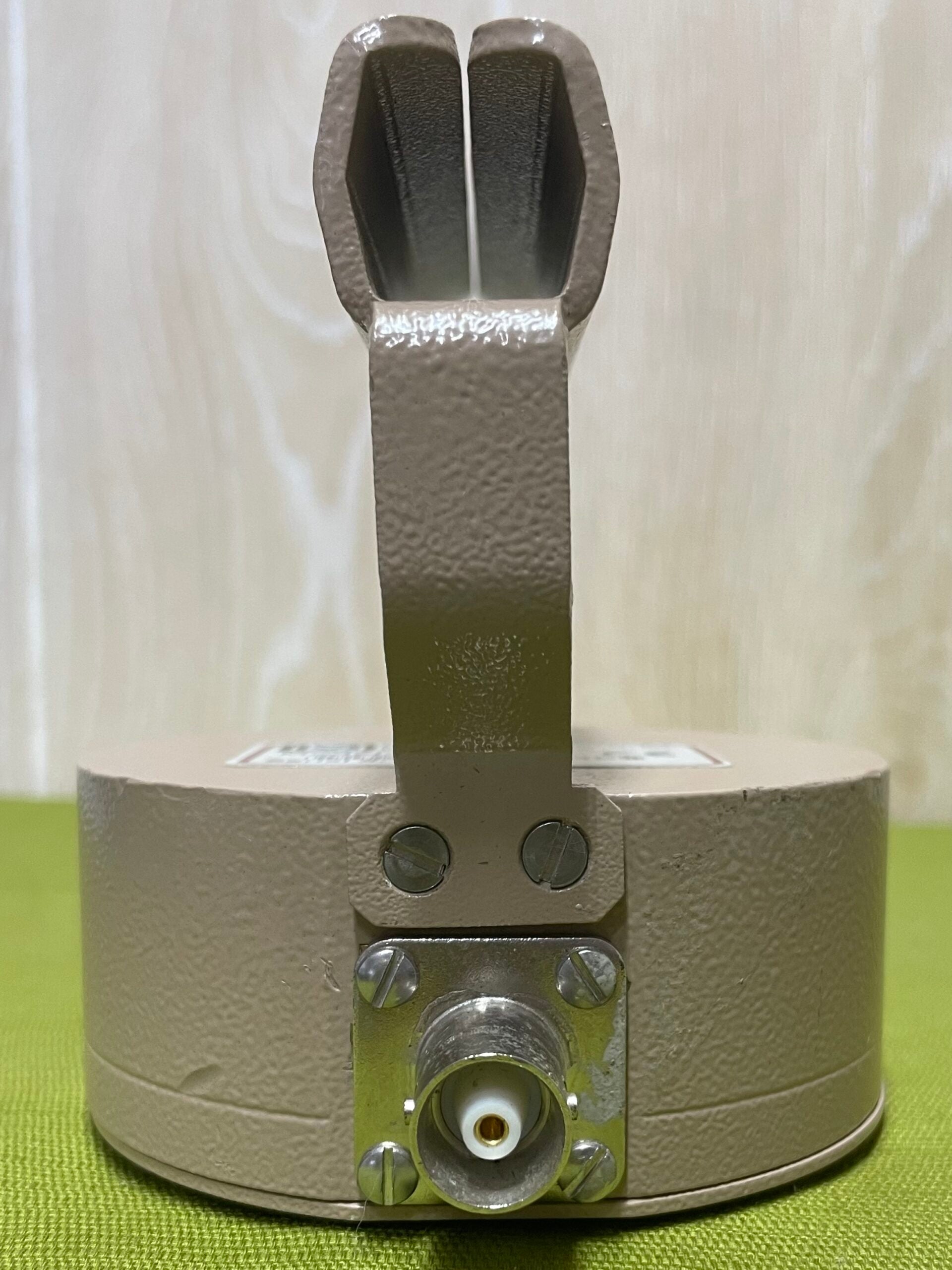 The front plate and handle are constructed from aluminum. All exterior surfaces are protected by a durable, splatter-finish, beige colored paint. Reference markings on the detector housing indicate the internal position of the embedded GM tube.